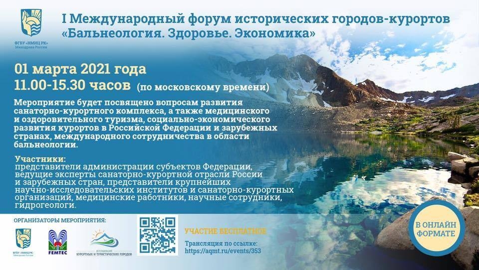 Федеральное государственное бюджетное учреждение «Национальный медицинский исследовательский центр реабилитации и курортологии» Министерства здравоохранения Российской Федерации приглашает Вас принять участие в работе I Международного форума исторических городов-курортов «Бальнеология. Здоровье. Экономика», который состоится 1 марта 2021 года в онлайн-формате.