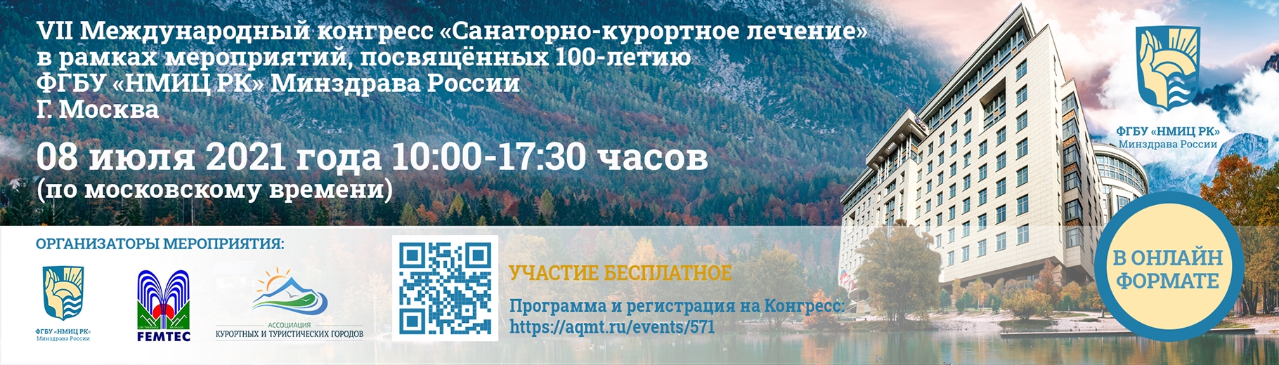 08 июля 2021 года состоится VII Международный конгресс "Санаторно-курортное лечение" в рамках мероприятий, посвященных 100-летию ФГБУ "НМИЦ РК" Минздрава России