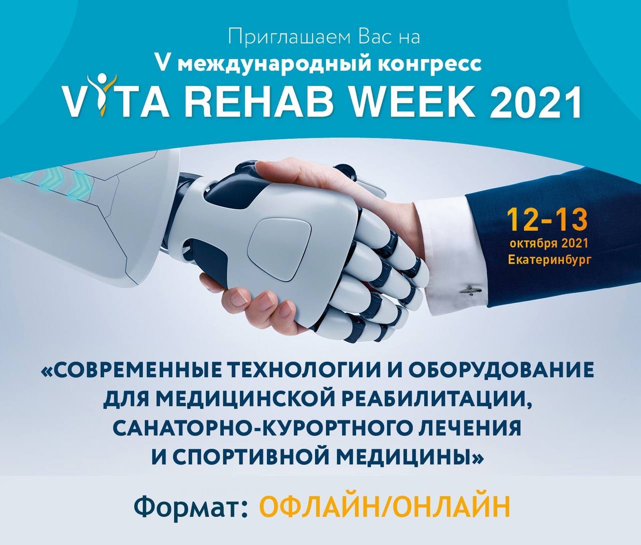 Приглашаем вас принять участие в V Международном научно-практическом конгрессе VitaRehabWeek-2021 «Современные технологии и оборудование для медицинской реабилитации, санаторно-курортного лечения и спортивной медицины», который пройдёт 12-13 октября в Екатеринбурге (Центр Международной Торговли Екатеринбург, ул. Куйбышева 44Д). Конгресс впервые пройдёт в инновационном ГИБРИДНОМ формате, сочетающим офлайн и онлайн.