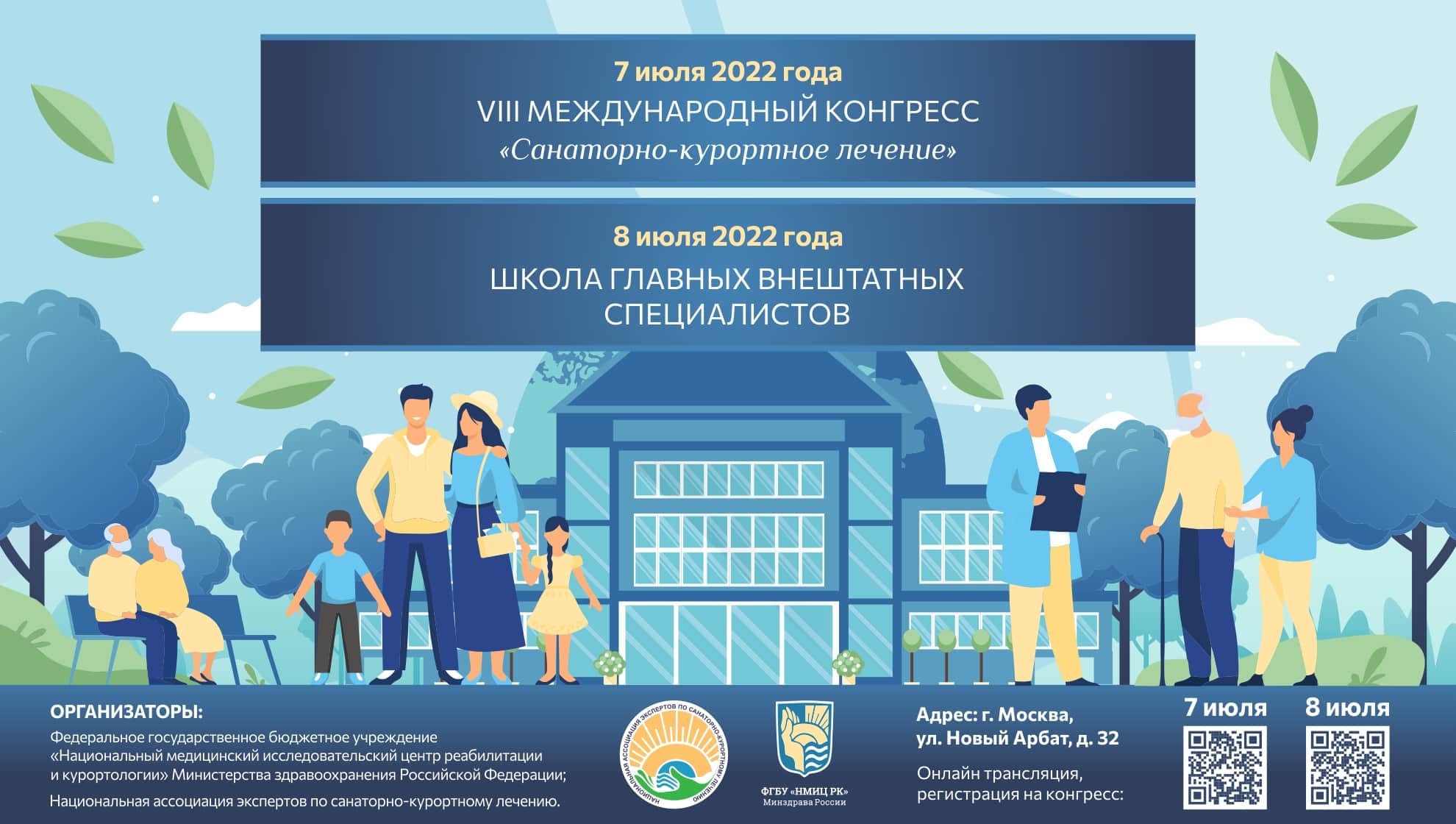 7 июля 2022 года Федеральное государственное бюджетное учреждение «Национальный медицинский исследовательский центр реабилитации и курортологии» Министерства здравоохранения Российской Федерации проводит VIII Международный конгресс «Санаторно-курортное лечение». Мероприятие посвящено вопросам развития санаторно-курортного комплекса в Российской Федерации.