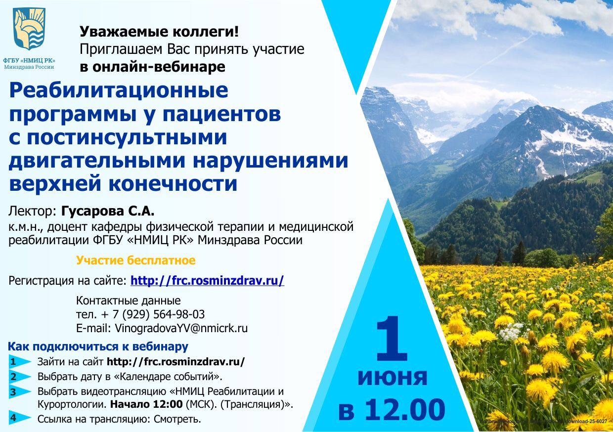 Приглашаем Вас принять участие в онлайн-вебинаре «Реабилитационные программы у пациентов с постинсультными двигательными нарушениями верхней конечности», который состоится 01 июня в 12.00.