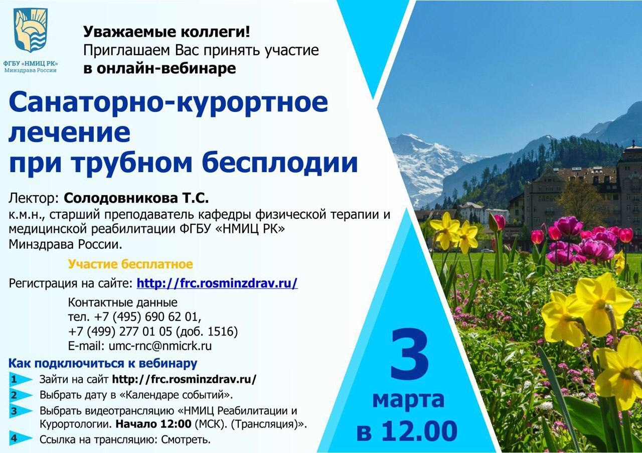 Приглашаем Вас принять участие в онлайн-вебинаре «Санаторно-курортное лечение при трубном бесплодии», который состоится 03 марта в 12.00.