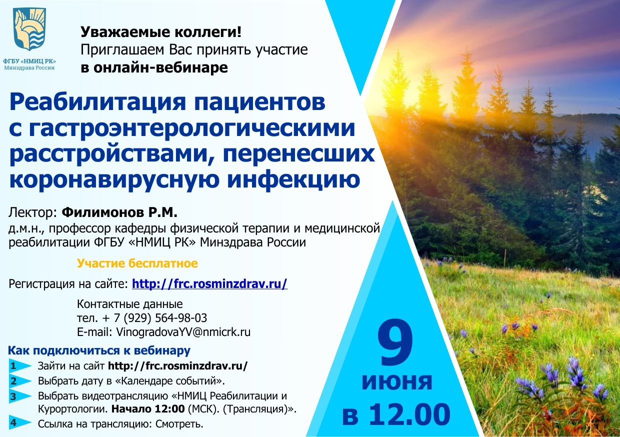 Приглашаем Вас принять участие в онлайн-вебинаре «Реабилитация пациентов с гастроэнтерологическими расстройствами, перенесших коронавирусную инфекцию», который состоится 09 июня в 12.00.