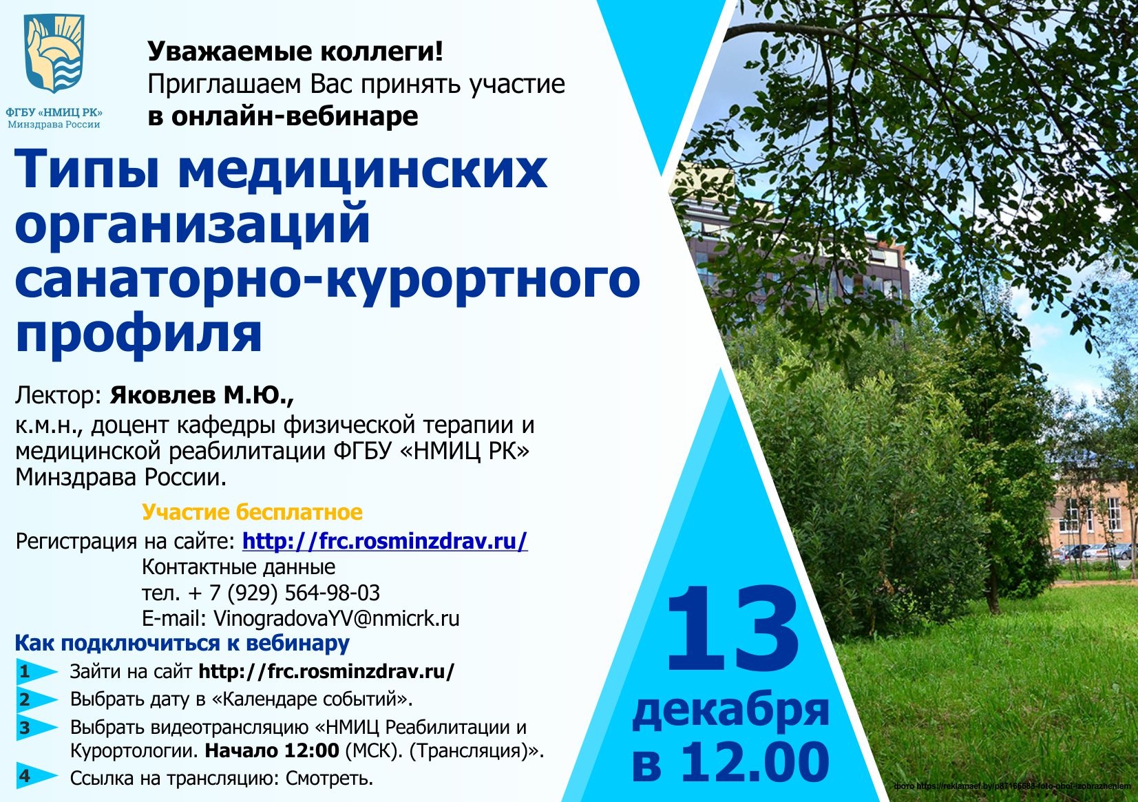 Приглашаем Вас принять участие в онлайн-вебинаре «Типы медицинских организаций санаторно-курортного профиля», который состоится 13 декабря в 12.00.
