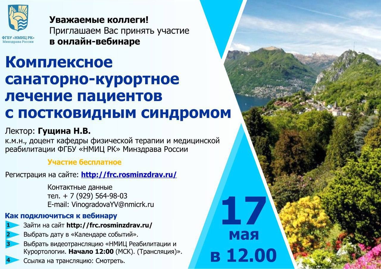 Приглашаем Вас принять участие в онлайн-вебинаре «Комплексное санаторно-курортное лечение пациентов с постковидным синдромом», который состоится 17 мая в 12.00.
