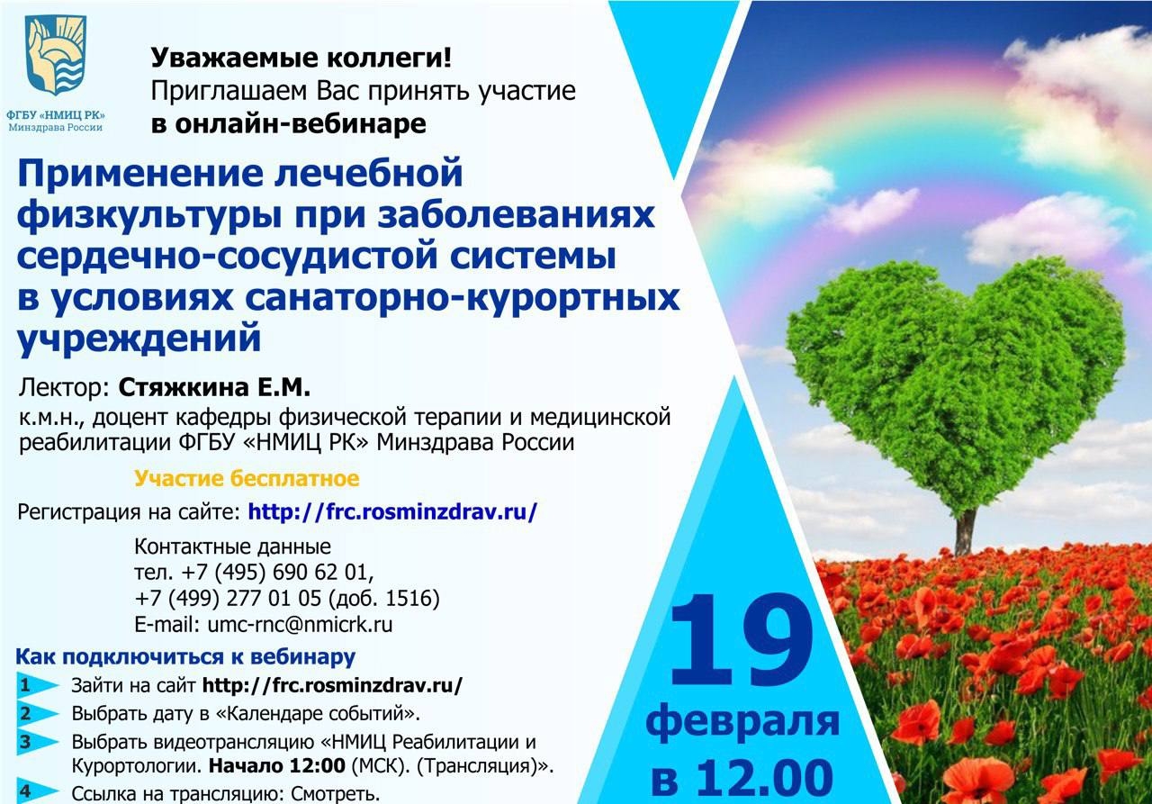 Приглашаем Вас принять участие в онлайн-вебинаре «Применение лечебной физкультуры при заболеваниях сердечно-сосудистой системы в условиях санаторно-курортных учреждений», который состоится 19 февраля в 12.00.