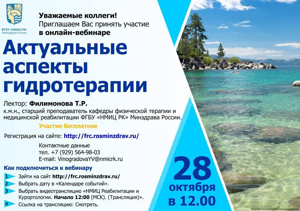Приглашаем Вас принять участие в онлайн-вебинаре «Актуальные аспекты гидротерапии», который состоится 28 октября в 12.00.