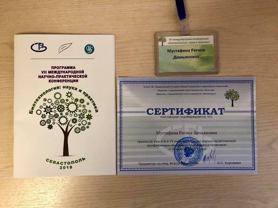 Промежуточные результаты выполняемых работ по проекту «Создание биопластического материала на основе внеклеточного матрикса» были представлены на VII международной научно-практической конференции «Биотехнология: наука и практика», проходившей в г. Севастополь (16-20 сентября 2019 г.).